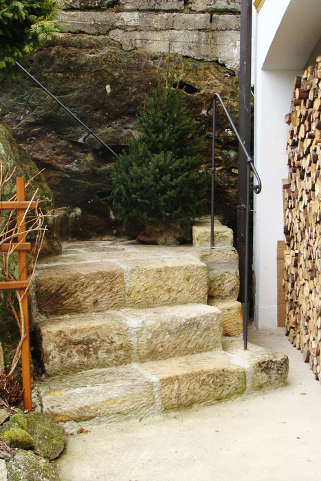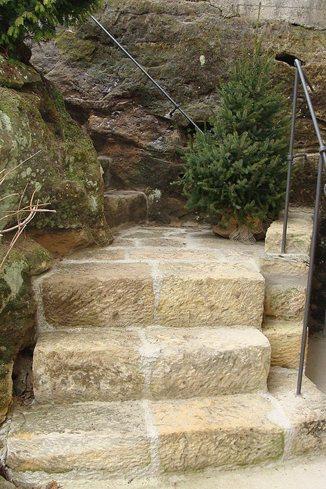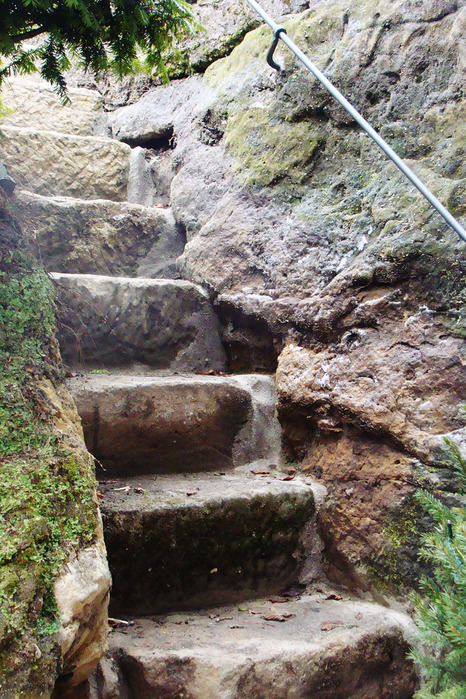 Položení pískovcových nášlapů k realizaci schodů zasazených do skály s kovaným zábradlím.