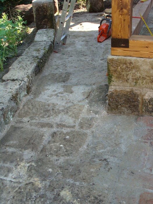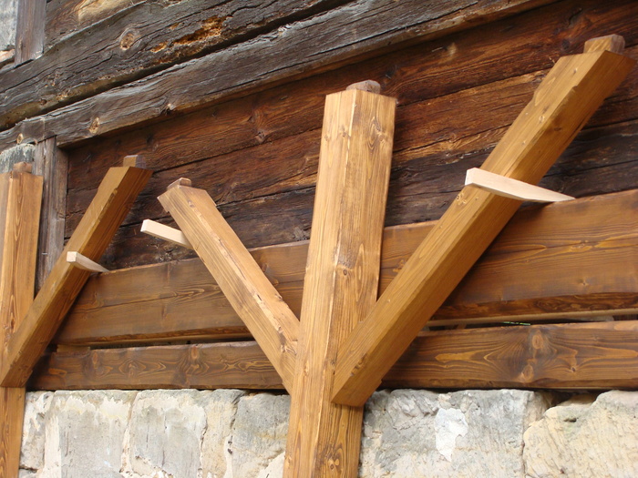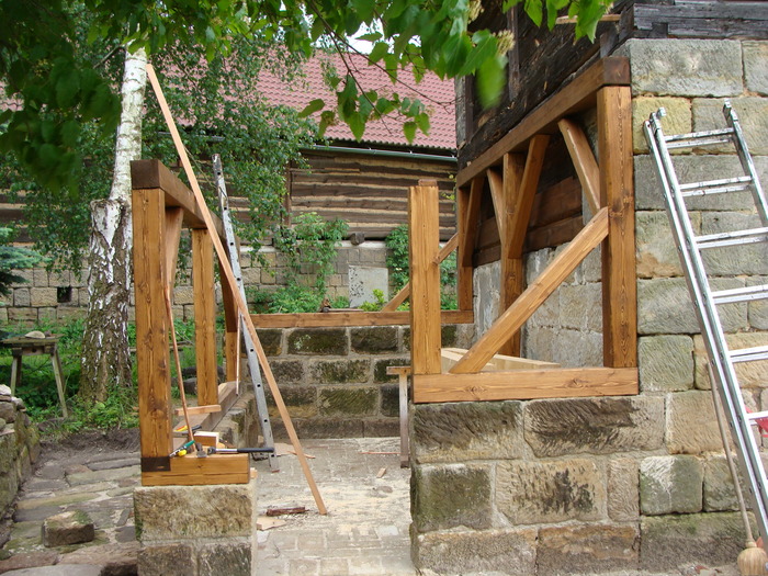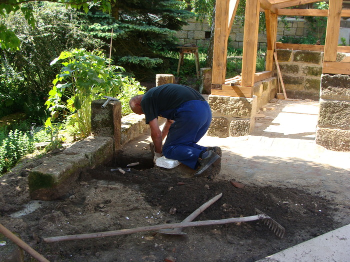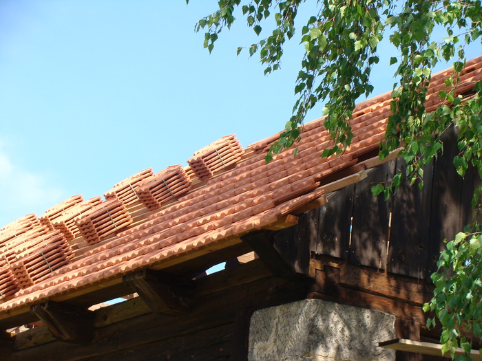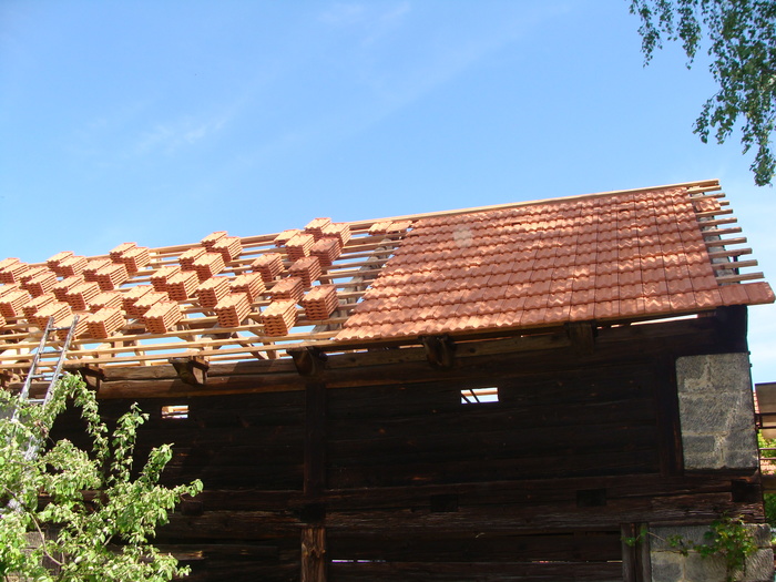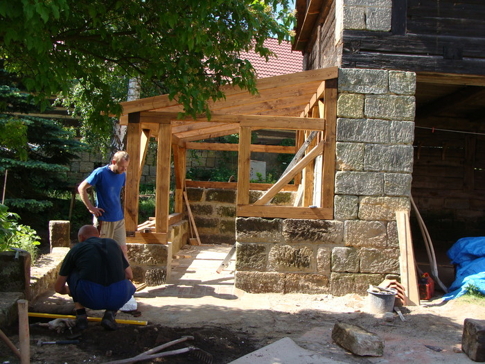 Rekonstrukce střechy na stodole vč. stavby přístřešku z masivu k boční straně stodoly, kde jsme kladli důraz na detail spojů k návaznosti pískovcům, aby vše vypadalo přirozeně ve stejném starém duchu. Na podlahu přístřešku byla použita stará očištěná cihelná dlažba a okolo přístřešku byla vsazena pískovcová dlažba.